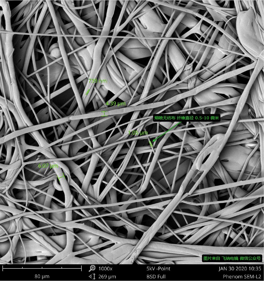 ในฐานะที่เป็นหัวใจของหน้ากาก Meltblown เป็นชั้นในการกรองแบคทีเรียและป้องกันไม่ให้เชื้อโรคแพร่กระจาย นอกจากนี้ยังสามารถกำหนดเป็นฟิล์มบาง ๆ ซึ่งประกอบด้วยเส้นใยที่ยืดแบบสุ่มไปยังทุกทิศทาง เส้นผ่านศูนย์กลางของเส้นใยเหล่านี้อยู่ภายใน0.5-10μmกว้างประมาณ 1/30 เป็นเส้นผม
